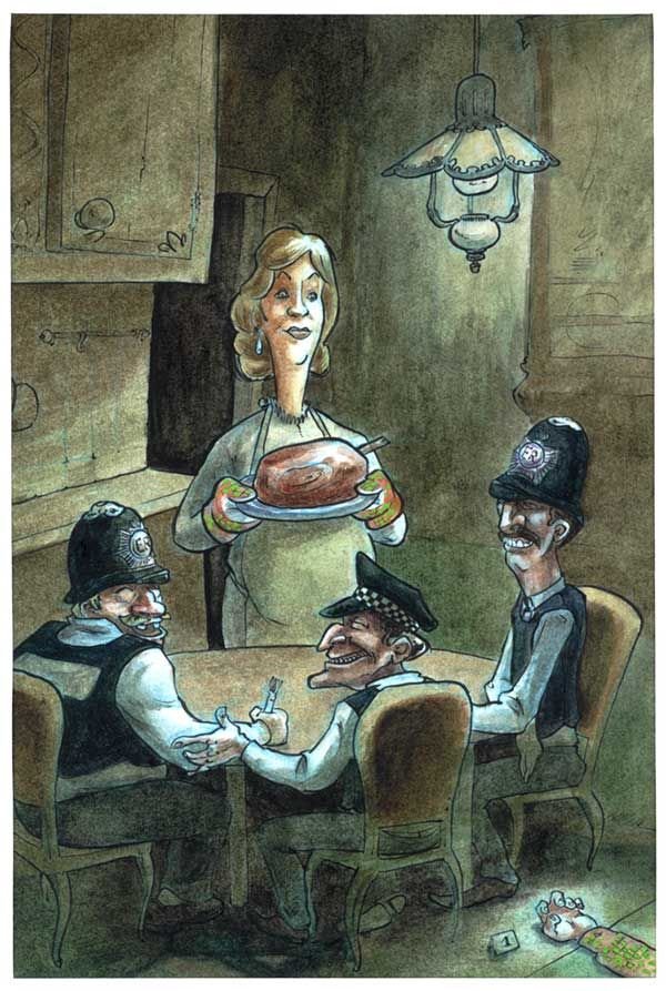 The police were convinced that a weapon as heavy as the one that killed their friend had a more likely chance of being left behind by the murderer .So the frantic search for the weapon began in Mary’s home and ended in vain and exhaustion . Seeing how tired they were Mary offers them the Lamp leg she was cooking in the stove and the policemen gladly partake of it. The policemen ate the food while o talking amongst themselves about the murder weapon and where it might have been hidden. At this moment one of the officers comments, “It’s probably right under our noses.”